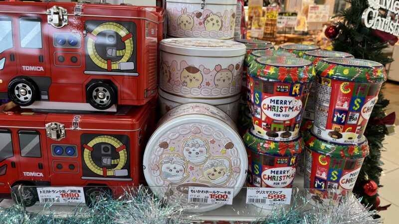 近所のせんどうのクリスマスコーナーにちいかわホールケーキ缶ありました!