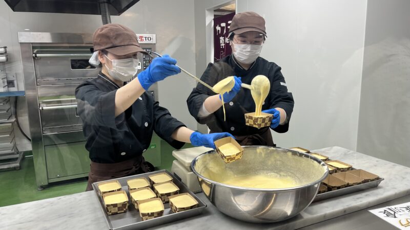 また、ライブキッチンでは目の前でカステラ作りの様子も見ることができます。